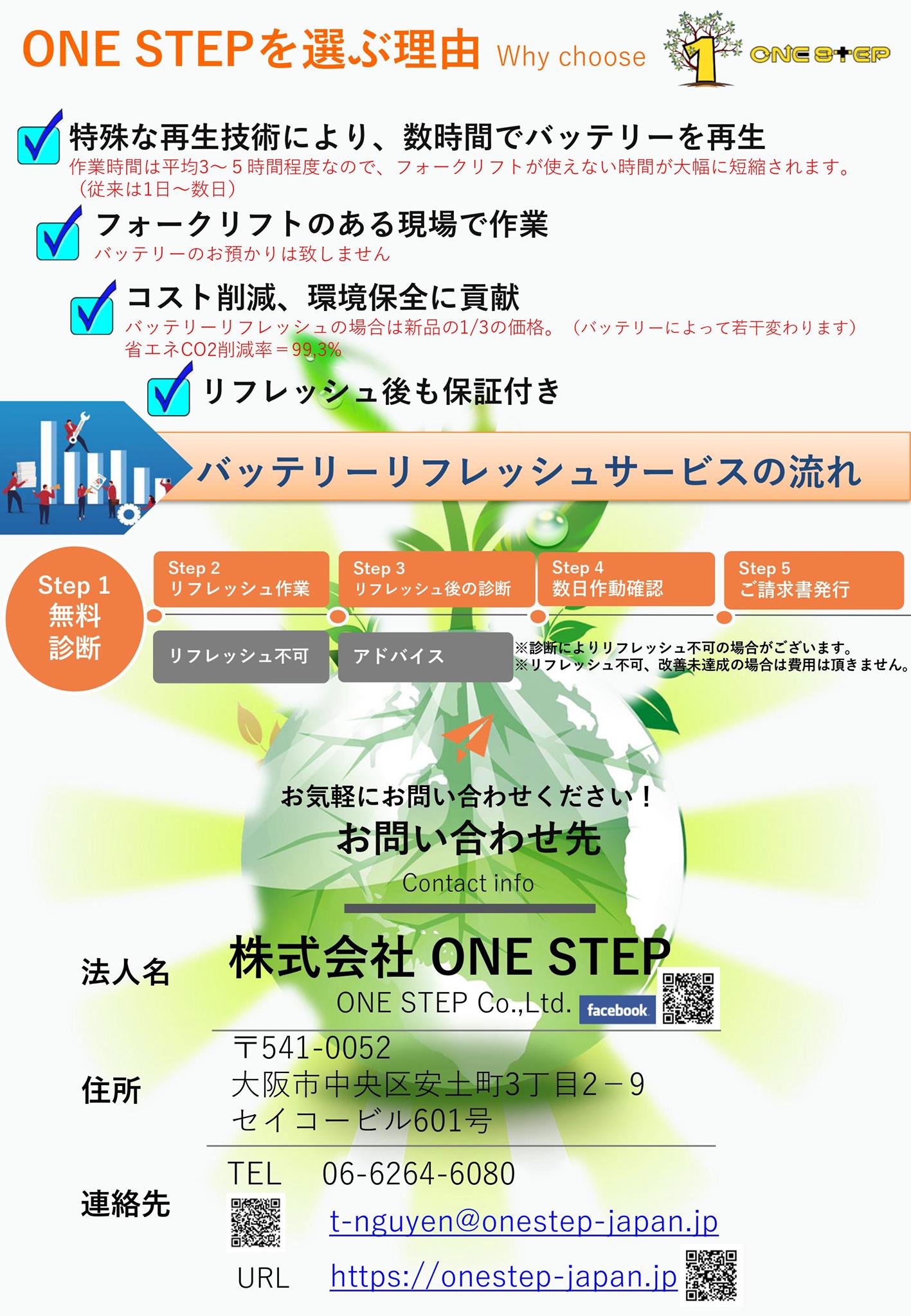 大型バッテリーのリサイクルは工場への輸送が大きなコストとなっていますが、ONE STEPではバッテリーのお預かりは致しません。現場で再生作業を致します!